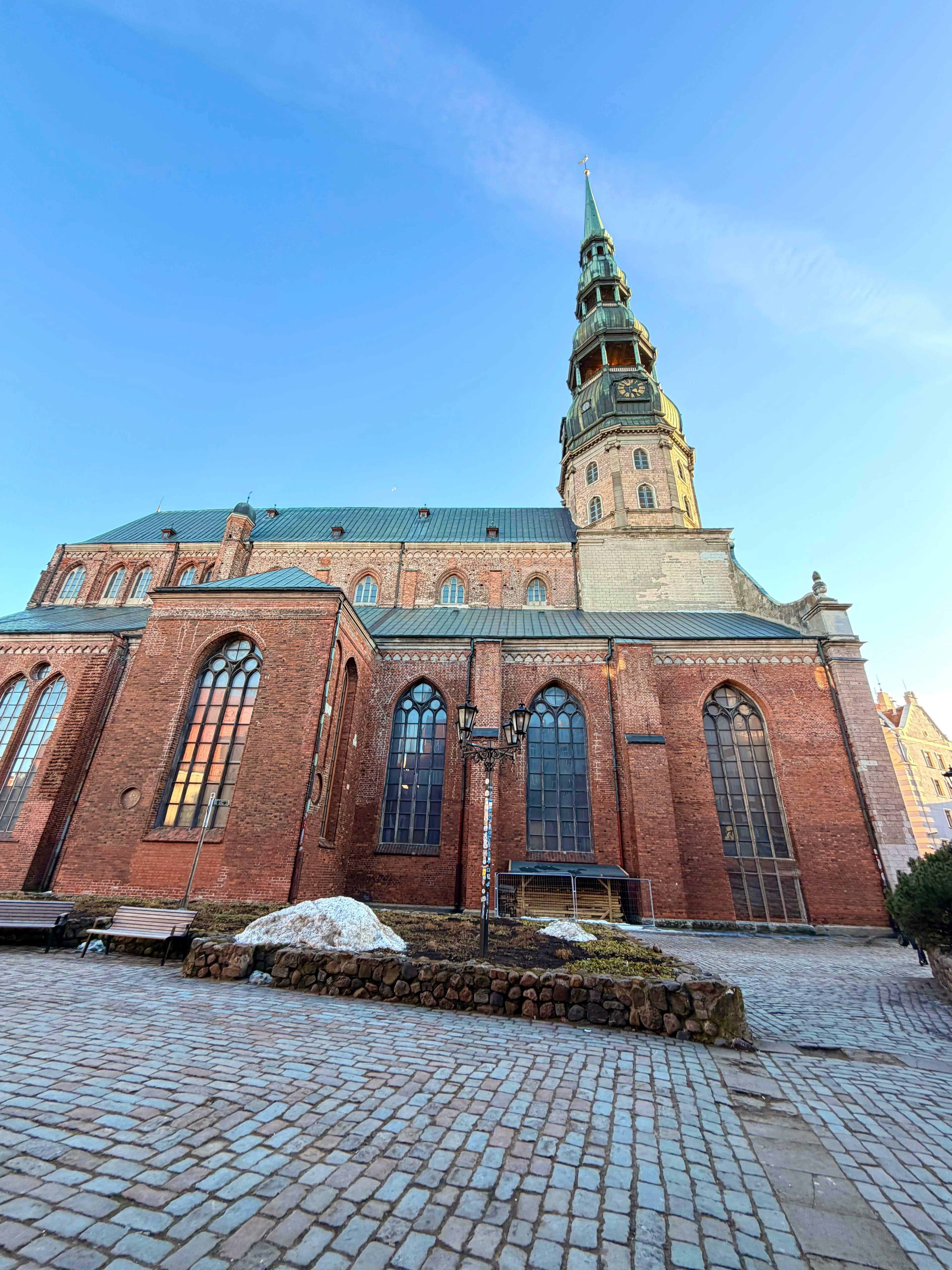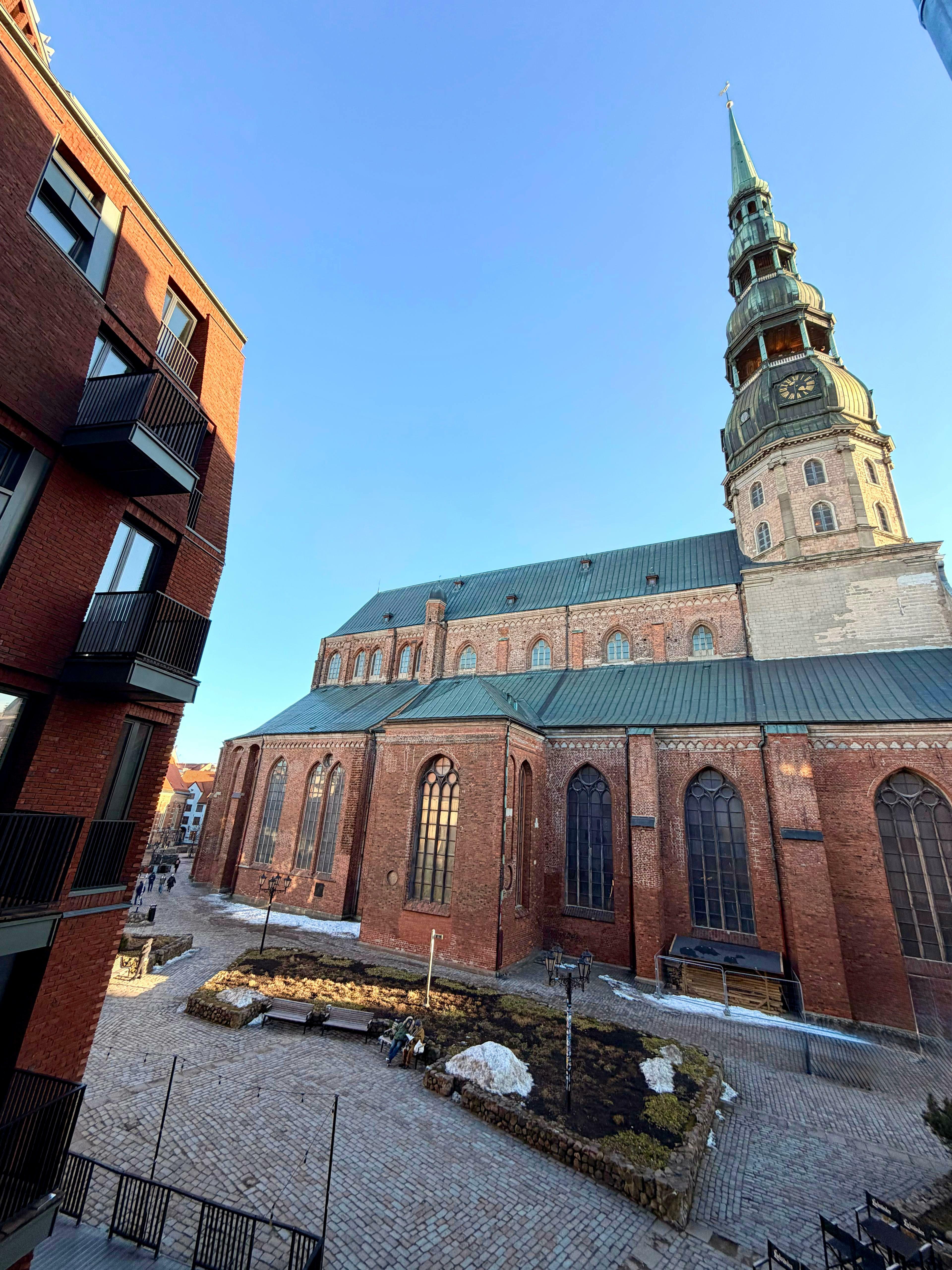 Dzīvokļa guļamistabas logs paver skaistu skatu uz Sv. Pētera baznīcu – vienu no ikoniskākajiem Vecrīgas simboliem, kas dzīvoklim piešķir īpašu vecpilsētas noskaņu.