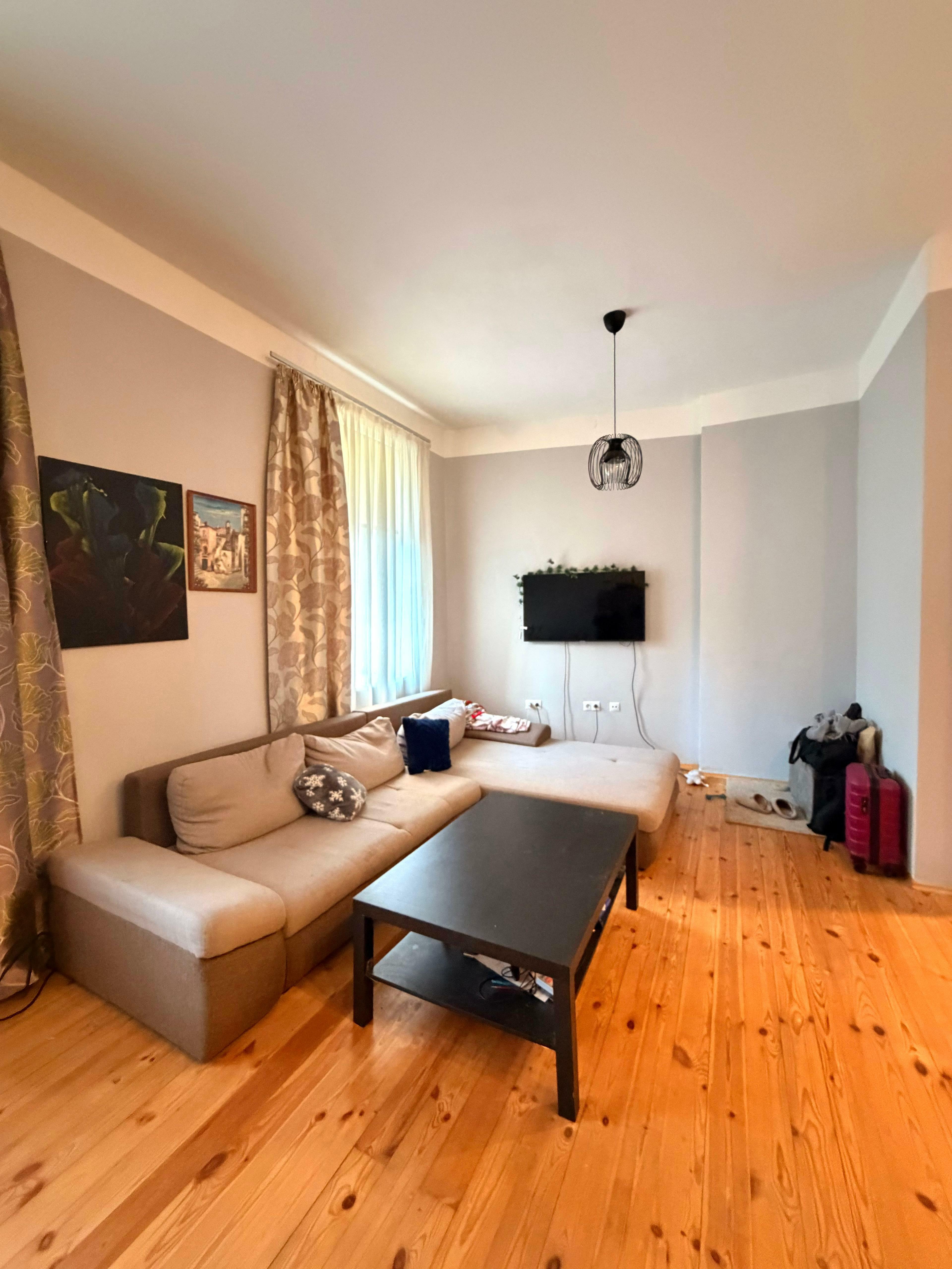 Viesistaba ir īpaši plaša un gaiša, ar lieliem logiem un patīkamu atmosfēru. Koka grīdas un augstie griesti rada siltu un mājīgu sajūtu. Virtuve aprīkota ar visu nepieciešamo sadzīves tehniku.