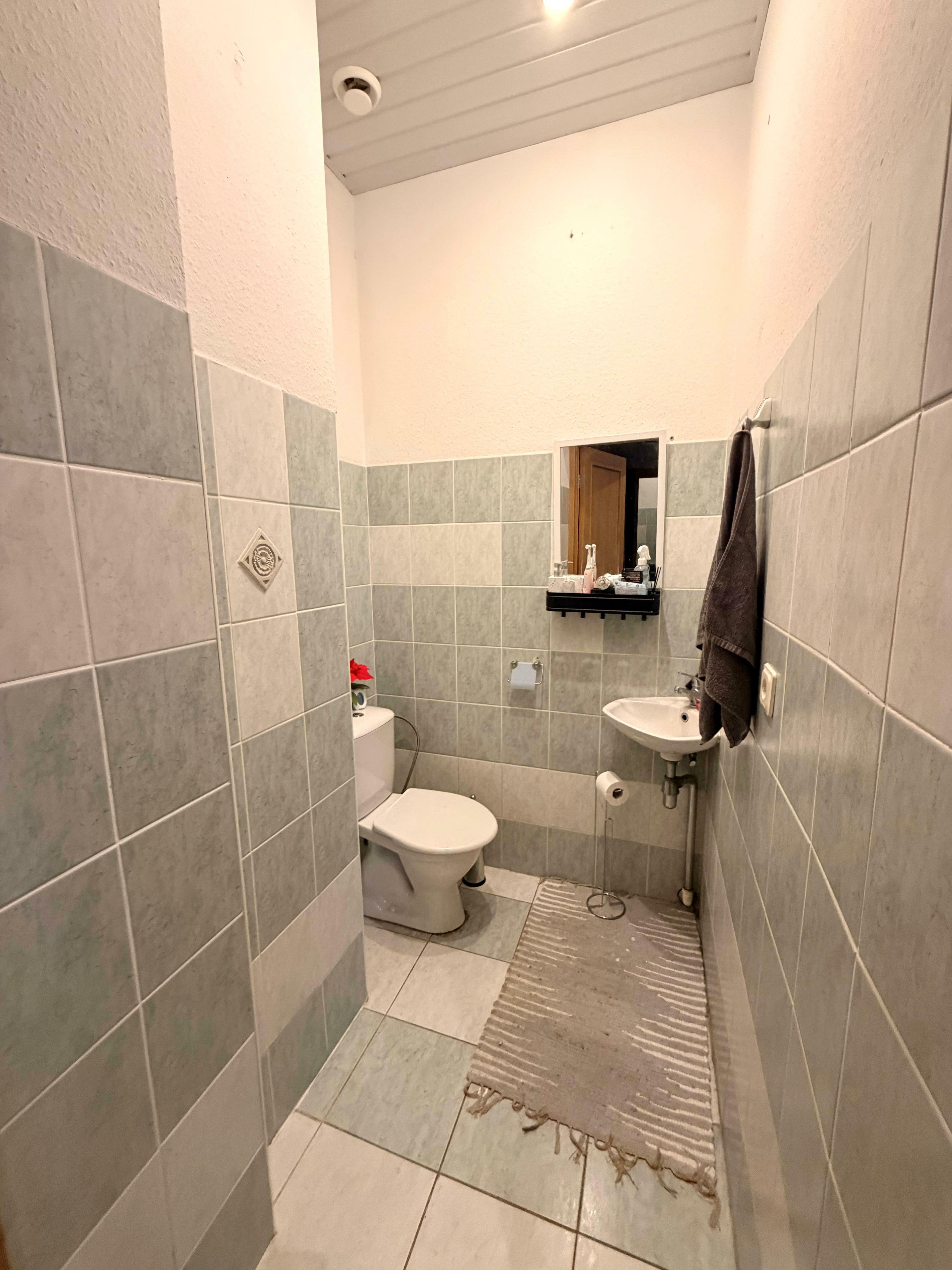 Dzīvoklī ir divas sanitārās telpas – viena plaša vannas istaba un atsevišķa tualete, kas nodrošina papildu komfortu ikdienā.