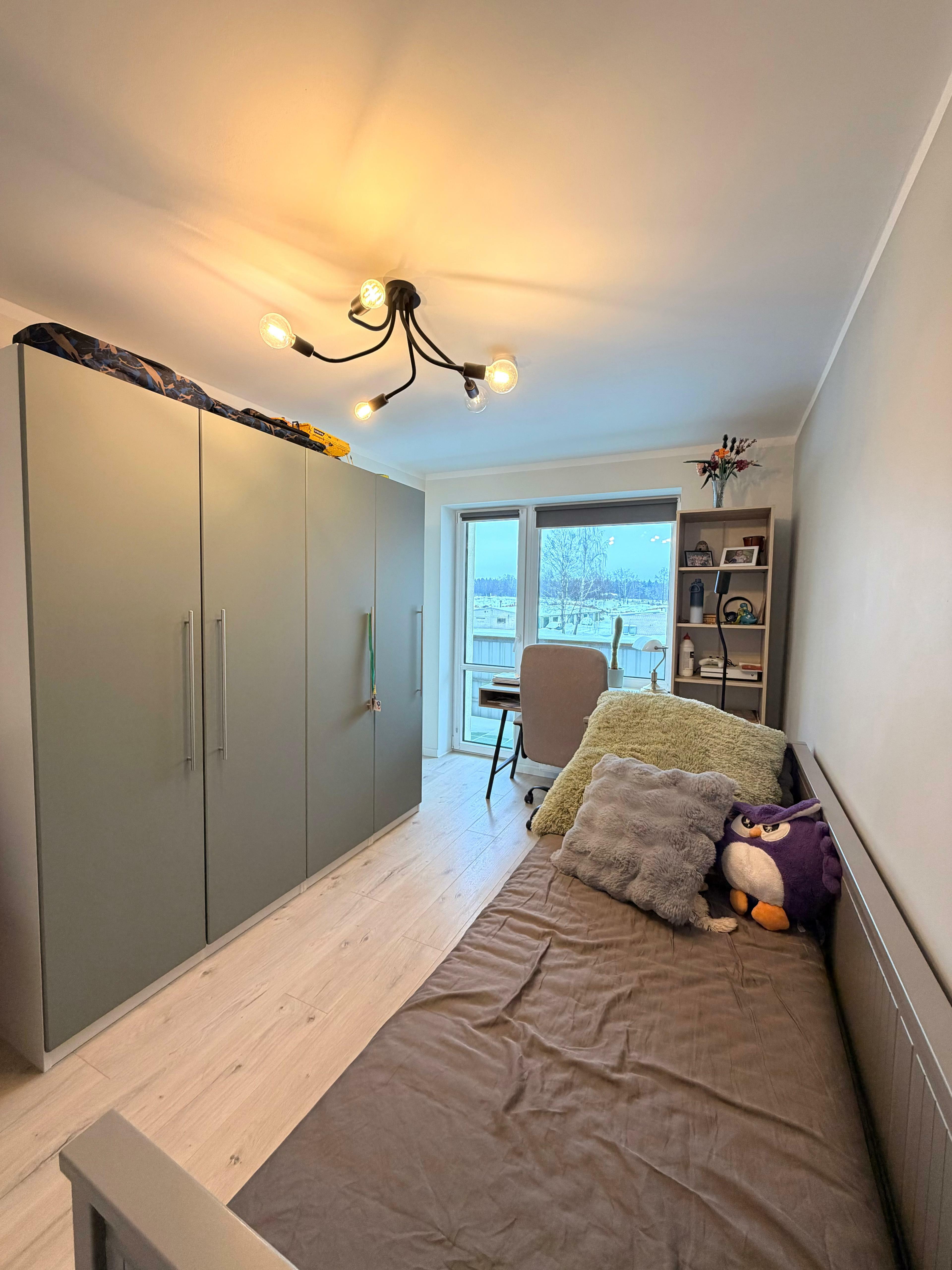 Dzīvoklī ir trīs atsevišķas istabas un plaša viesistaba, kas apvienota ar virtuves zonu, nodrošinot ērtu ikdienas lietošanu. No visām trim istabām ir izeja uz balkonu, kas ir būtiska priekšrocība papildu telpas sajūtai un ventilācijai. Plašs koridors ļauj ērti izvietot skapjus un nodrošina pietiekami daudz vietas mantu uzglabāšanai. Vannas istaba un tualete ir atsevišķi, kas ir praktisks risinājums ikdienas lietošanai.