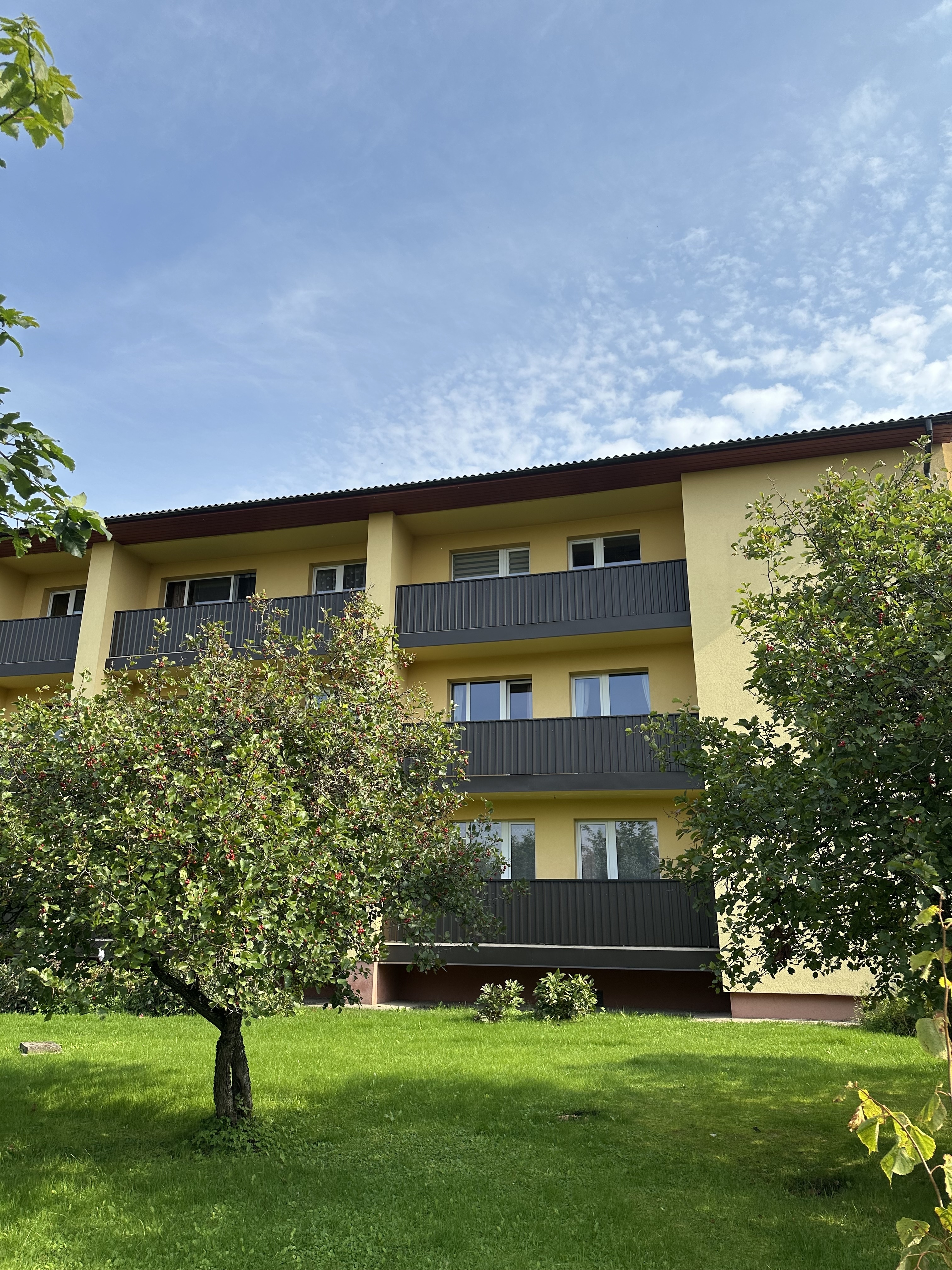 Dzīvoklis atrodas trešajā stāvā (3/3). Māja ir renovēta, kāpņu telpa – tīra, gaiša un kopta. Kopts, sauss, plašs pagrabs ērtai mantu uzglabāšanai. Pie mājas vienmēr pieejama autostāvvieta.