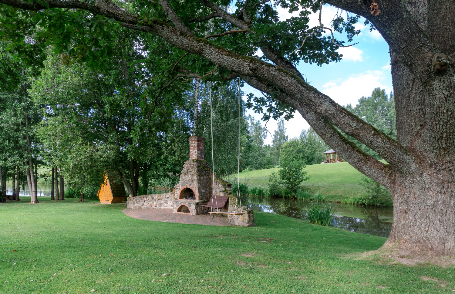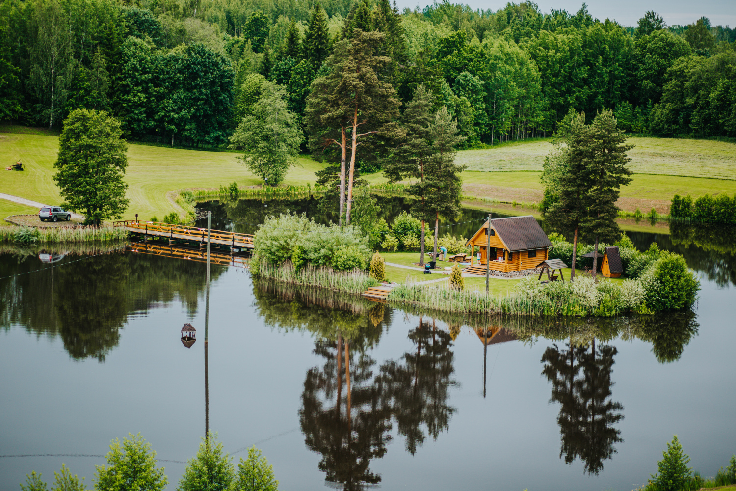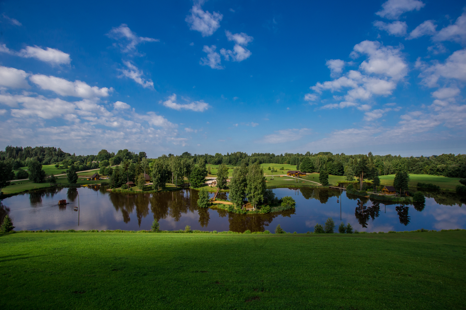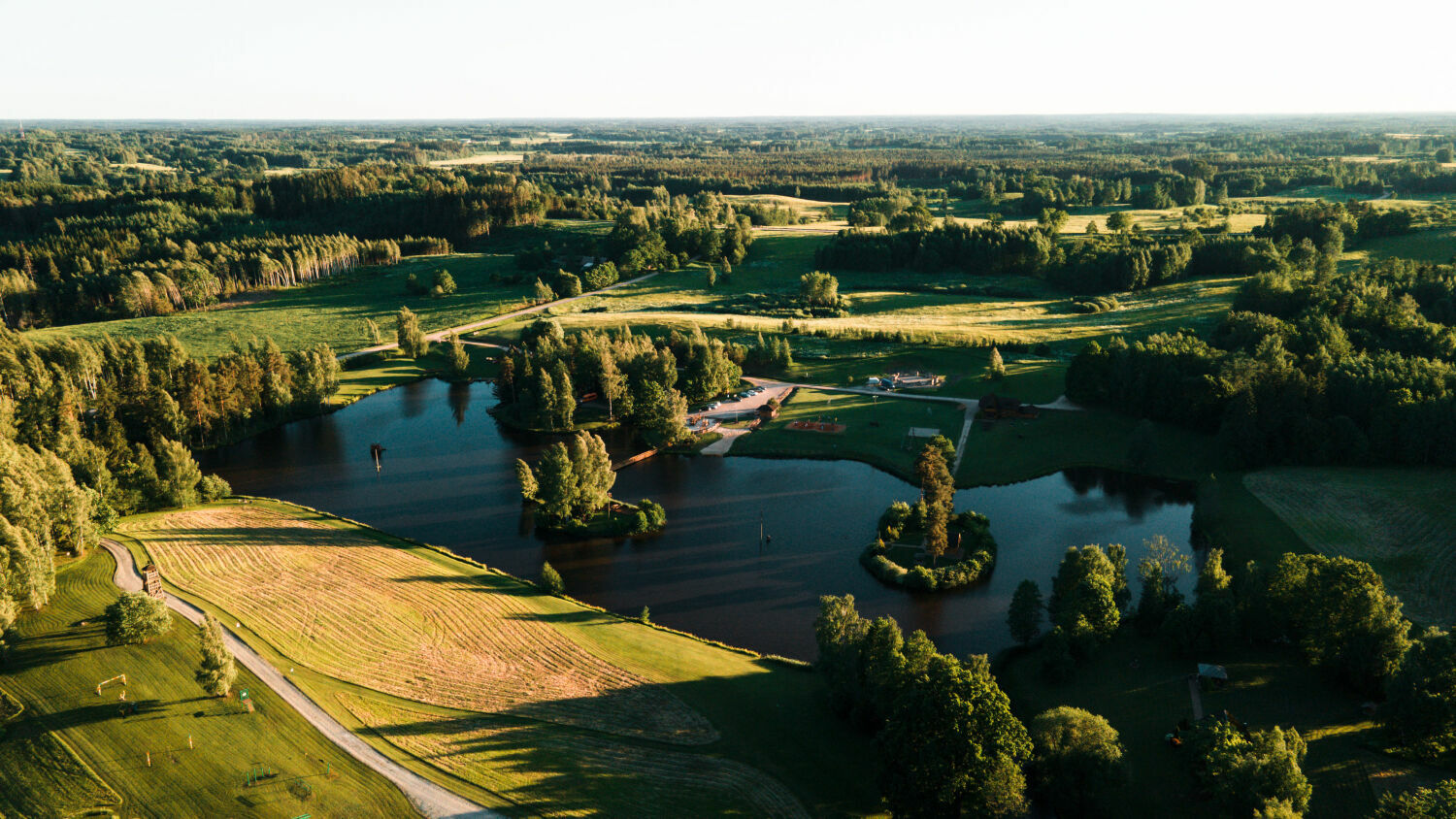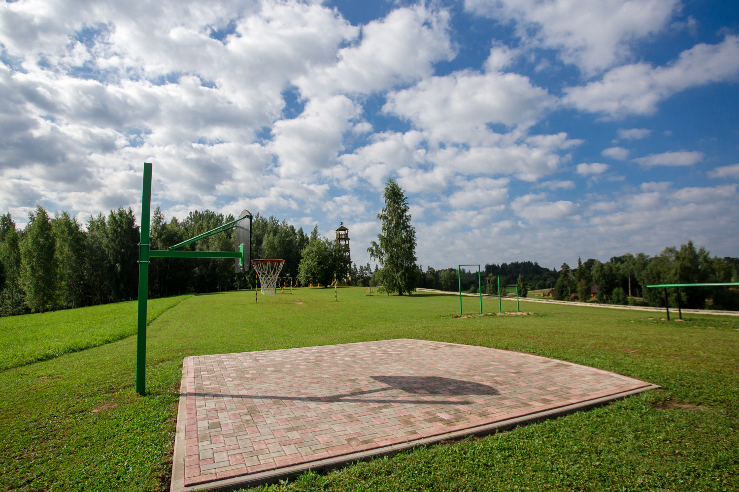 Teritorijā izveidota plaša aktīvās atpūtas infrastruktūra — futbola, volejbola un strītbola laukumi, bērnu rotaļu laukums, labas kvalitātes gājēju tilti, kas savieno salas, kā arī 12 metrus augsts skatu tornis, no kura paveras iespaidīgi panorāmas skati. Šie elementi ir tehniski kvalitatīvi un kalpo gan praktiskām vajadzībām, gan vizuālai pievienotajai vērtībai. Dabas tuvums ir sajūtams ik uz soļa — īpašumā ir gan ūdens, gan reljefa līmeņi, gan plašas zālienu zonas, kas piemērotas lieliem pasākumiem.