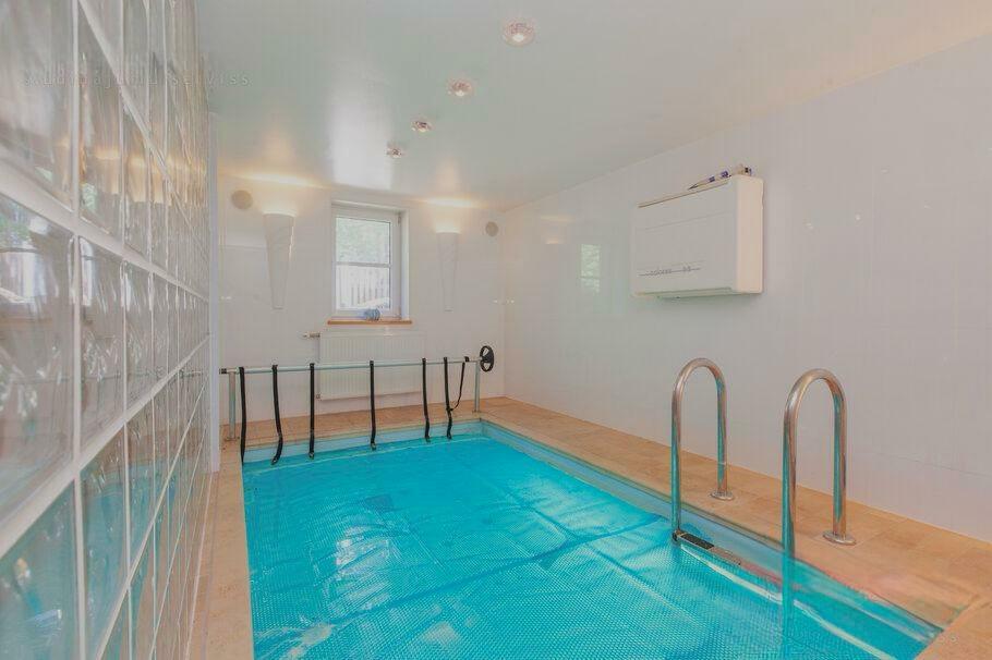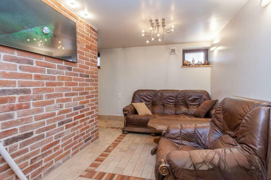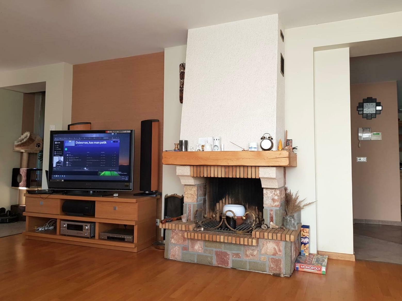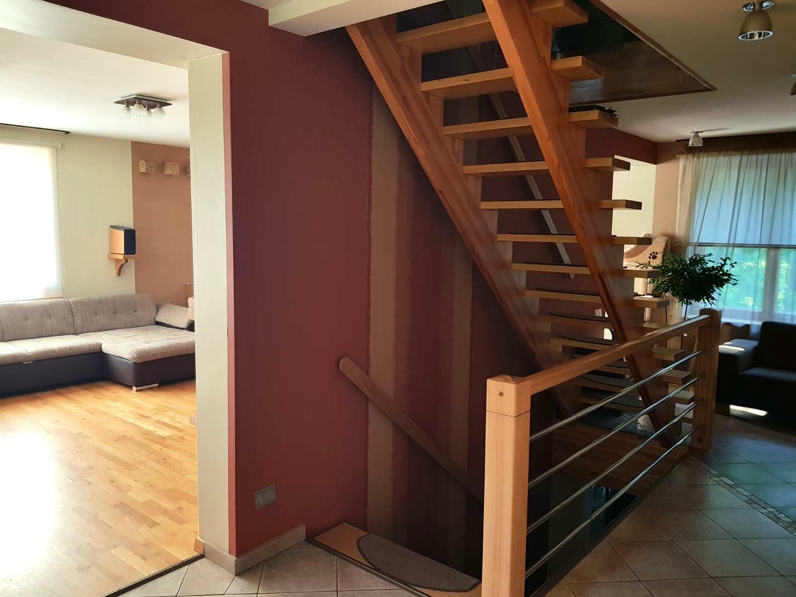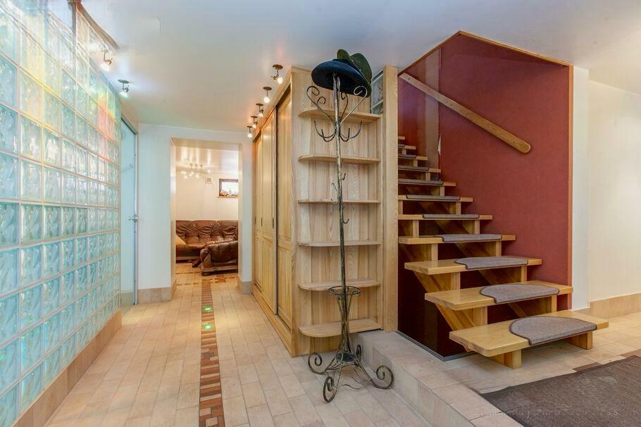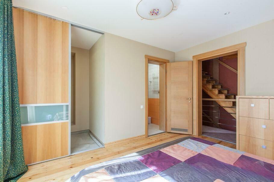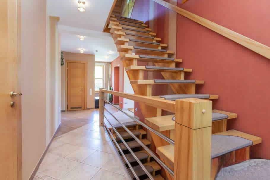 Pirmajā stāvā atrodas plaša garāža, centrālās apkures malkas katls, vannasistaba un tualete, kā arī atpūtas telpa, kuru iespējams izmantot kā biljarda zāli vai trenažieru telpu. Šajā stāvā ir arī sauna un baseins ar pretstraumi. Otrais stāvs ir funkcionāli pārdomāts – tajā atrodas plaša viesistaba ar kamīnu, virtuve, tualete un liela guļamistaba ar atsevišķu dušas telpu. Trešajā stāvā ir trīs guļamistabas, halle un dušas telpa ar tualeti.