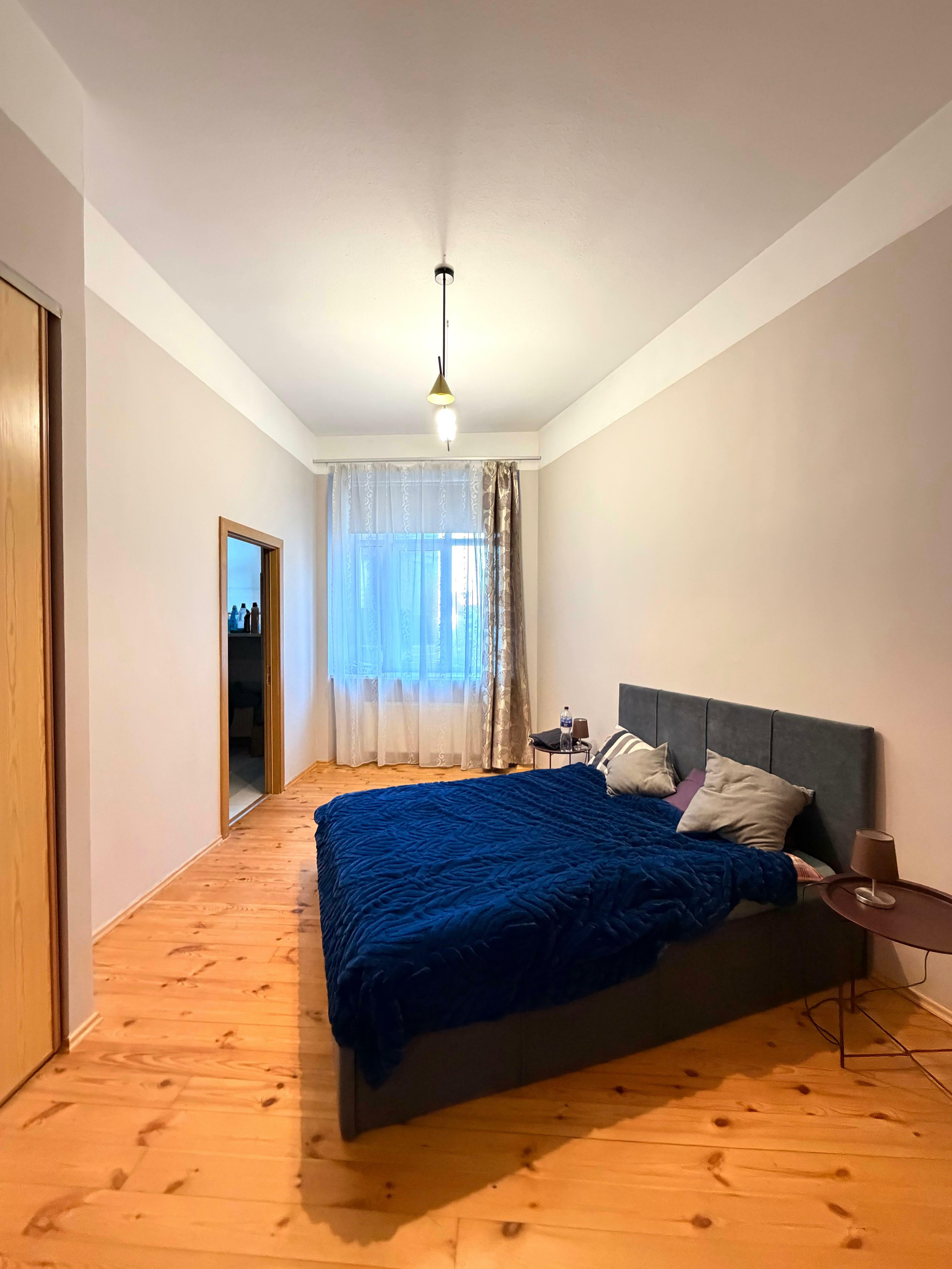 Dzīvokļa guļamistabas logs paver skaistu skatu uz Sv. Pētera baznīcu – vienu no ikoniskākajiem Vecrīgas simboliem, kas dzīvoklim piešķir īpašu vecpilsētas noskaņu.