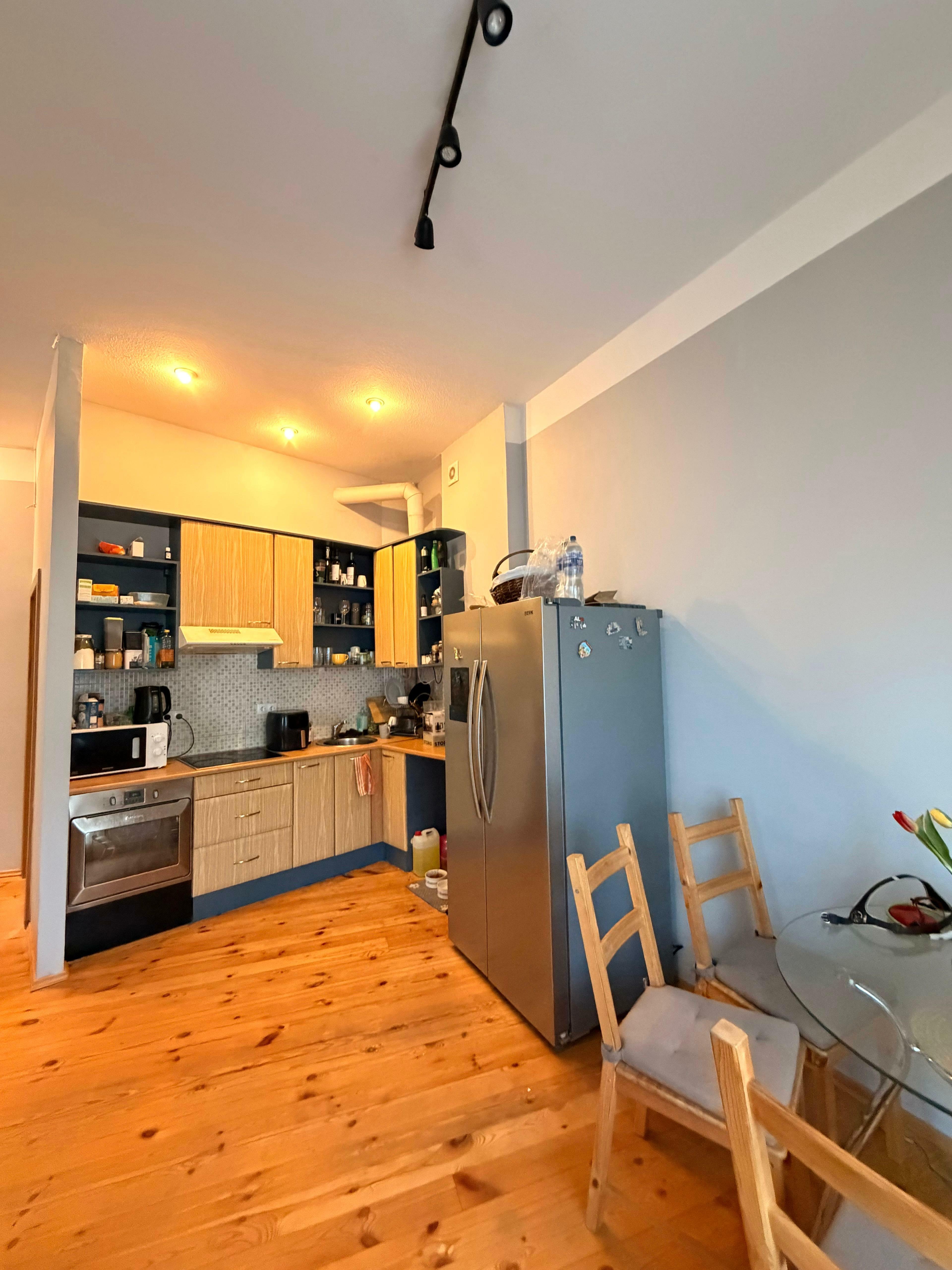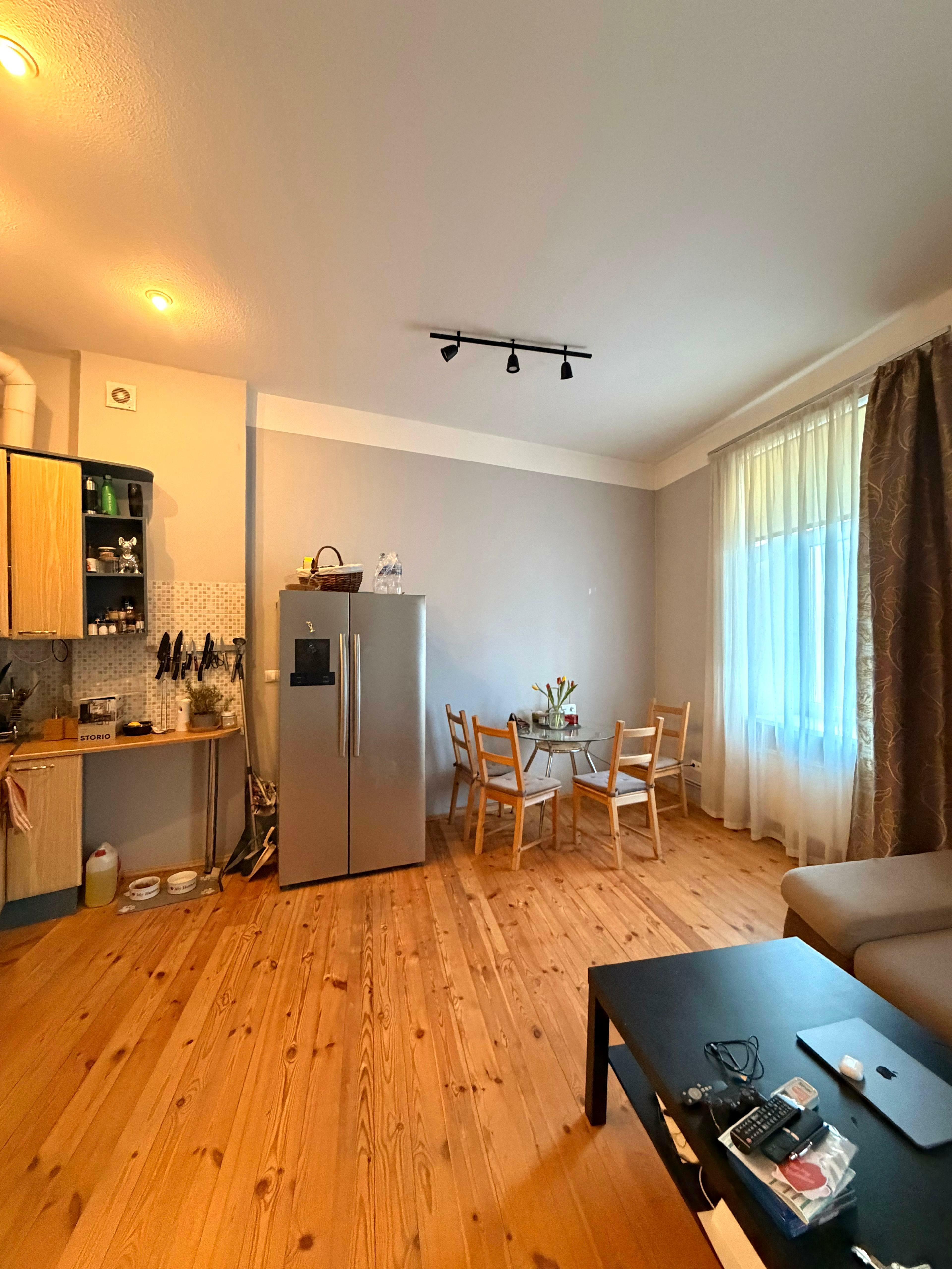 Viesistaba ir īpaši plaša un gaiša, ar lieliem logiem un patīkamu atmosfēru. Koka grīdas un augstie griesti rada siltu un mājīgu sajūtu. Virtuve aprīkota ar visu nepieciešamo sadzīves tehniku.